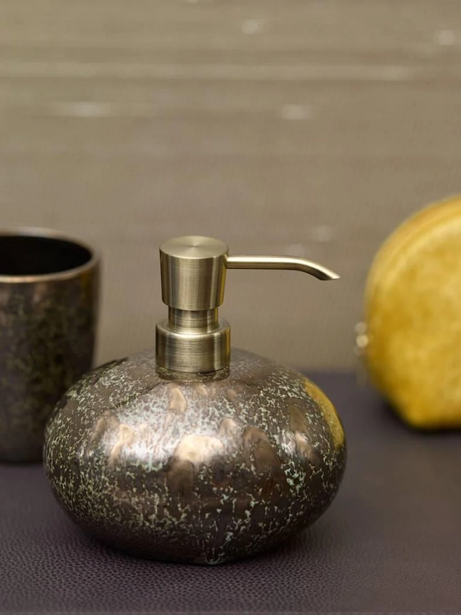 De ovale eigentijdse Aquanova zeepdispenser Ugo Vintage Bronze-854 (500 ml) is van keramiek, die stevig is en bestand is tegen vocht. Hij is ovaal van vorm en handgemaakt van geglazuurd stoneware met eigentijdse print en heeft een pompkop in de kleur messing.