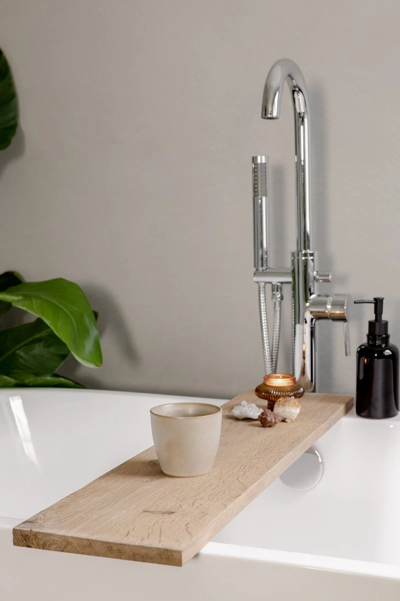 Onze luxe badplank past perfect in een moderne badkamer. De plank is vervaardigd uit massief eikenhout en geeft nog meer warmte in de badkamer.
