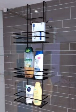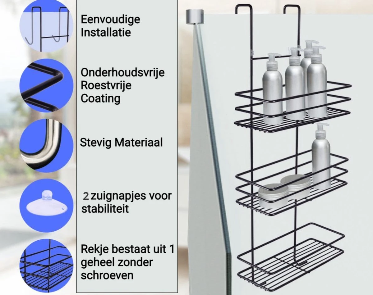 Met dit Zwarte doucherek 2 laags kan je moeiteloos je shampoo flessen, douchegel en of wisser plaatsen in de 2 aanwezige mandjes, en op elk gewenste plek binnen handbereik over je douchecabine hangen.
