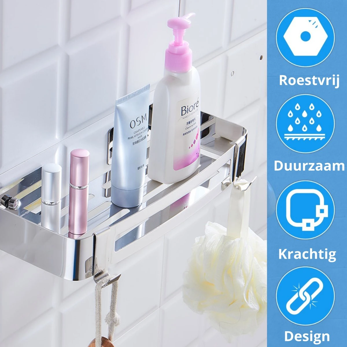 Het 2-laagse doucherek is van 100% RVS wat ervoor zorgt dat het doucherekje niet alleen roestvrij is, maar ook erg stevig. Door de gleuven in de bodem van elke etage kan het water altijd wegstromen, waardoor er geen kalkaanslag op het doucherekje kan vormen. Zo bent u verzekerd van een lange levensduur.