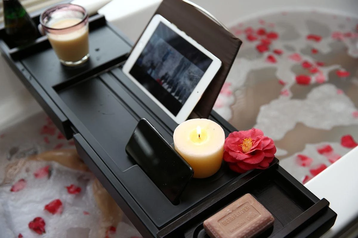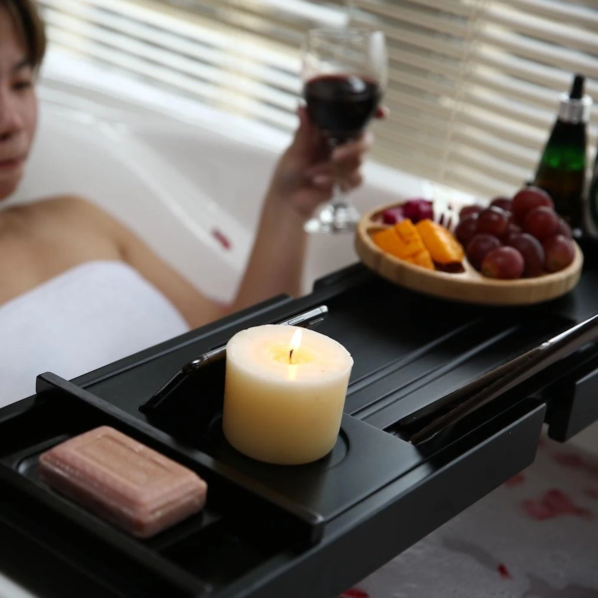 Luxe verstelbaar Bamboe Badrek. Heerlijk ontspannen in bad wordt nog lekkerder met dit mooie verstelbare luxe bamboe badrekje. Zo heb je alles binnen handbereik, je drankje. biertje of wijntje, chips, kaarsen, boek, telefoon en zelfs je tablet.