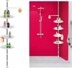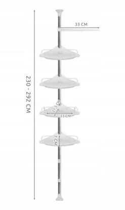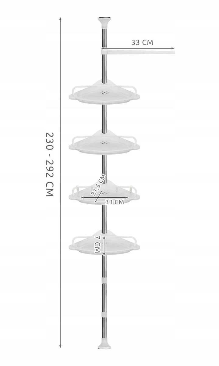 Deze telescopische douchehoek kan universeel worden gebruikt in douchewanden, doucheruimtes en hoeken. De praktische hoekplank is gemaakt van gepoedercoat roestvrij staal en beschikt over 4 verstelbare etages met trays met een draagvermogen van 3kg elk. Dit biedt tal van opslagruimte voor shampoo, douchegel, zeep, sponzen en andere doucheaccessoires. Bovenaan het rek hang een roteerbaar handdoekrail voor het opbangen van badgoed. Tevens beschikt de onderste tray over een en haken die kunnen evenens kunnen dienen als handdoekrek. De montage is erg eenvoudig aangezien geen gereedschap of boren vereist is. Dankzij de telescopische stang is de hoogte verstelbaar van 230 cm – 295 cm.