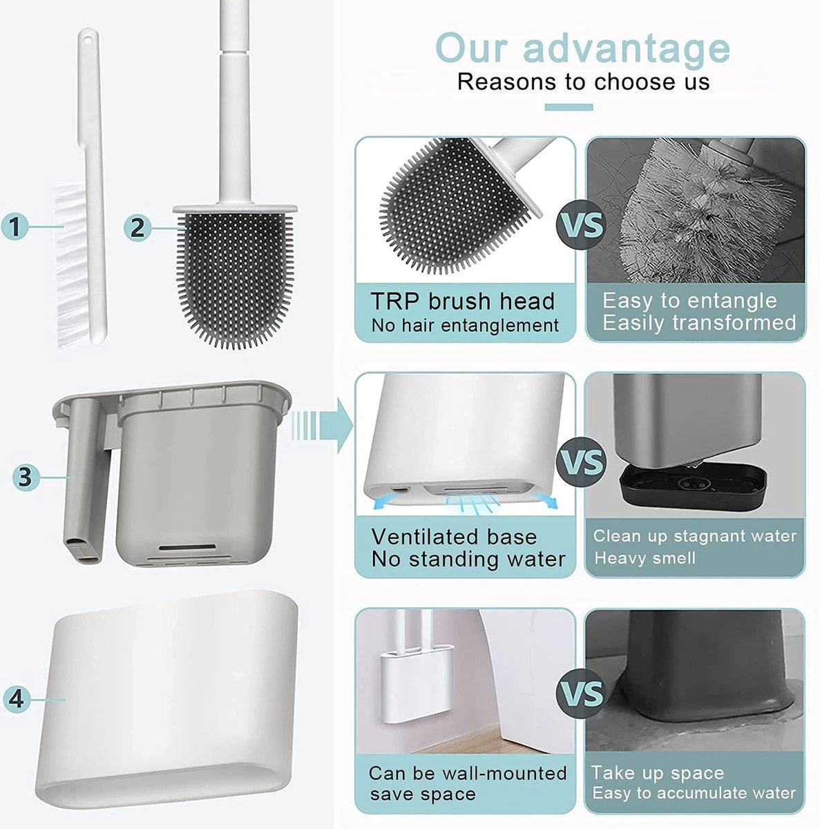 De open ontwerpbasis vergemakkelijkt de ventilatie en kan overtollig water snel op de toiletreinigingsborstel verdampen. De unieke ingebouwde lekbak kan voorkomen dat watervlekken de vloer vervuilen en is zeer eenvoudig te verwijderen en schoon te maken.