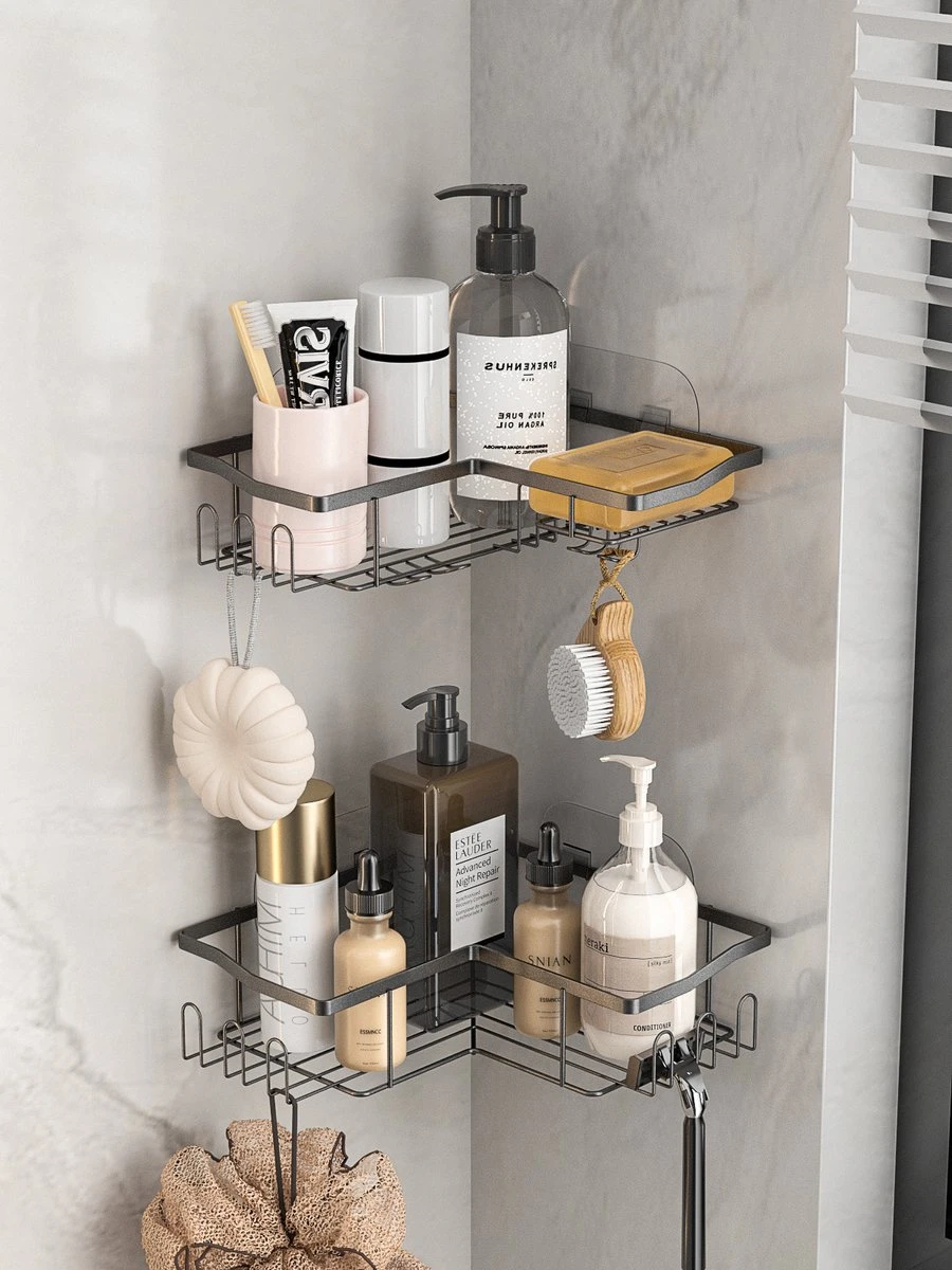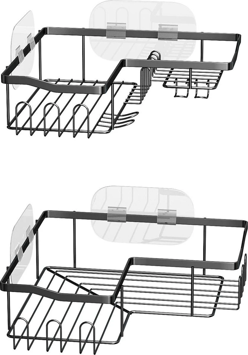 STRICX Doucherekhoek 2 Laags Zwart – Zonder Boren – Zelfklevend Doucherek – Doucherek – Doucherek Voor Badkamer/ Keuken – Doucherek Met Plakstrip – Keukenrek Met Plakstrip – Badrek Douche – Doucherek Hoekvorm – Badkamerrek Douchemandje