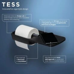 Modern en functioneel design. De subtiele, ronde vormen van deze zwarte Tiger Tess toiletrolhouder zorgen voor meer balans en rust in de badkamer. Het planchet biedt extra ruimte voor bijvoorbeeld je mobiele telefoon. Plak de houder aan de muur of monteer hem met schroeven en pluggen. Aan jou de keuze. Tiger Tess is innovatief en eigentijds met de herkenbare kwaliteit van Tiger. Deze serie is ontworpen door ons Design Lab en heeft een erkenning gekregen van Goed Industrieel Ontwerp (GIO).